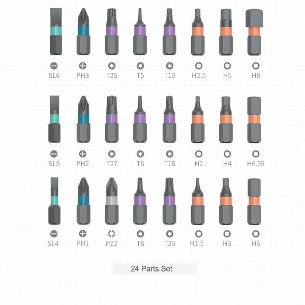 24 industriklassade S2 krom-molybdenum legering stålskruvmejselbitar, genomgått kontinuerlig värmebehandling. 5 typer av skruvmejshuvuden för att möta behoven av professionellt bruk, hemmabruk, arbete, gör-det-själv och underhåll. Arbetsbesparande 6,2-graders spärrdesign, 58-tands positiv och negativ rotations spärrstruktur, sparar 80 % av ansträngningen.